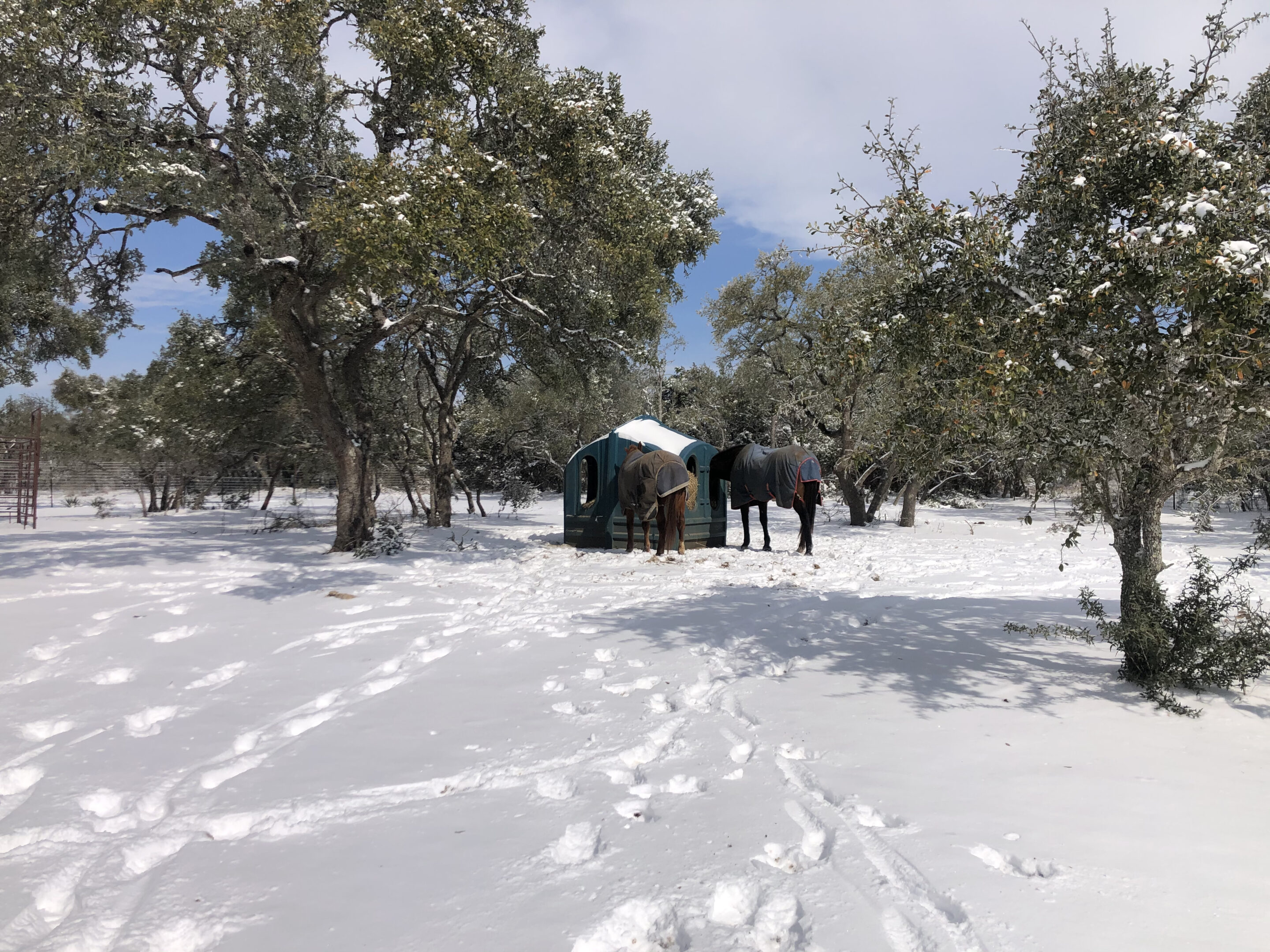 Then, I began offering her Horse Quencher on a regular basis for peace of mind. Why not? The upside is huge and the downside is small. A colic call costs more than a 3.5-pound bag of product. My horses crave the Apple flavor. When they smell it, they begin pawing. Other flavors include – Butterscotch, Peppermint and Root Beer. See: https://www.horsequencher.com When dealing with a blizzard and ice storm or any adverse weather at my Texas home and barn, I offer my horses Horse Quencher before and after the major weather events.
